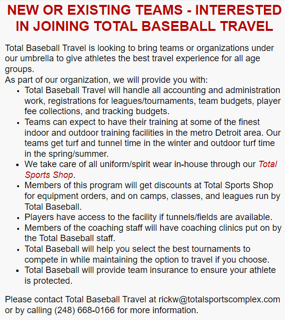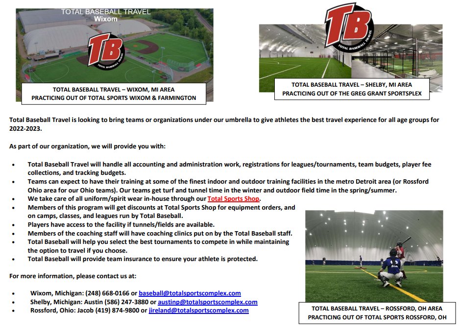 Total Baseball Travel-Wixom Tryouts will be held on the following dates at our outdoor Home. 1 Great Lakes Wave 5-1-0 2 Full Tilt Baseball 5-0-1 3 Total Baseball Travel St. The travel season will run from January through July with winter workouts starting the 3rd week of January.